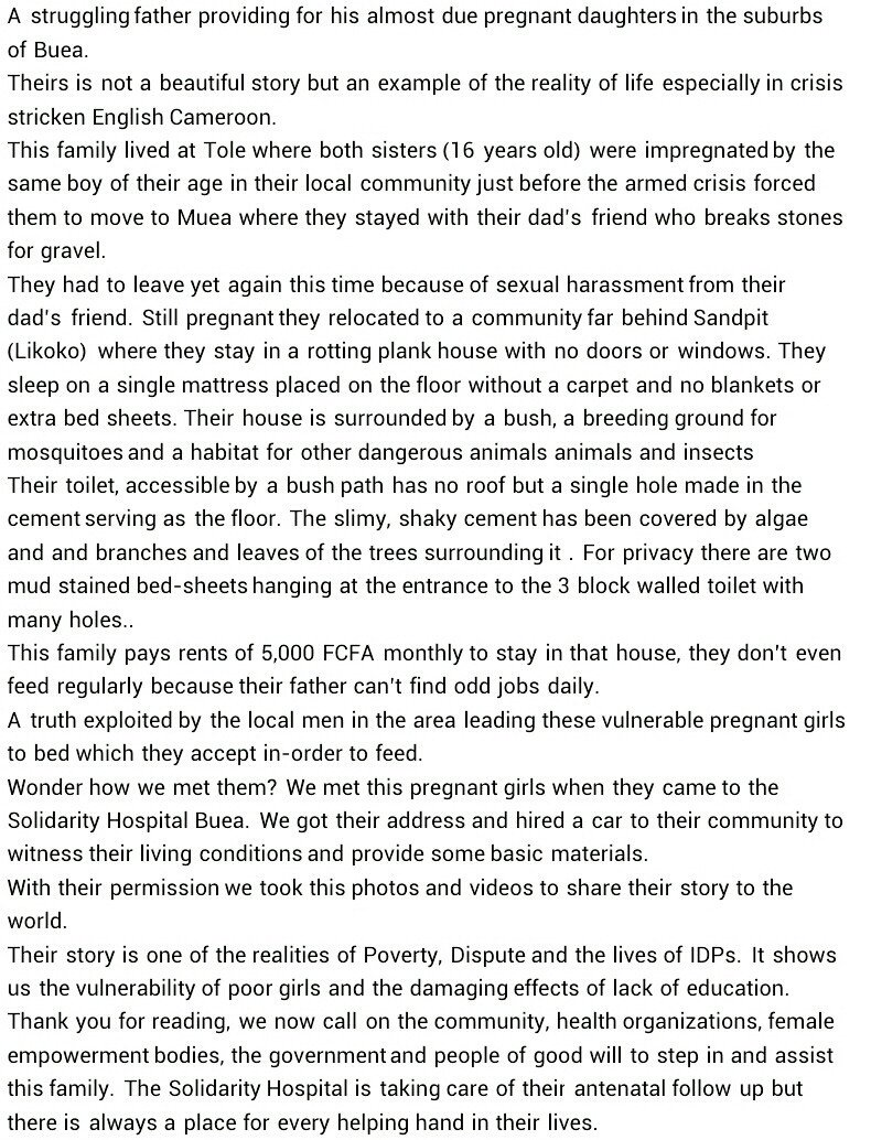 Wonder how we met them? We met this pregnant girls when they came to the Solidarity Hospital Buea. We got their address and hired a car to their community to witness their living conditions and provide some basic materials. With their permission we took this photos and videos to share their story to the world.