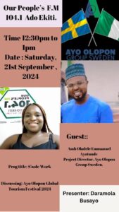 The Ayo Olopon Global Tourism Festival Competition 2024 is a collaborative event between the Ekiti State Bureau of Tourism Development (Office Of The Governor) and Ayo Olopon Group Sweden.
