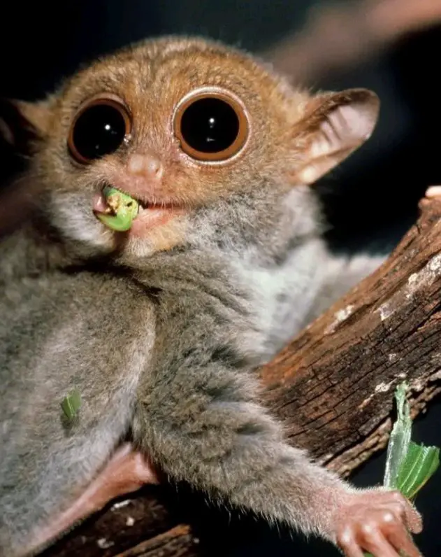 The family Tarsiidae includes tarsiers, which are haplorrhine apes. They are tiny nocturnal creatures with enormous eyeballs that measure about 16 mm (0.63 in) in diameter and are thought to be at least as big as the entire brain.