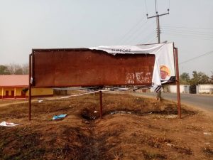 Heritagenewsng.com reports that the campaign  billboard of the leading All Progressives Congress Governorship aspirant, Mr Biodun Abayomi Oyebanji has been destroyed by thugs alleged to be supporting the aspiration of a co-contestant and current member of the Red chamber, Senator Michael Opeyemi Bamidele(M.O.B) in Iyin-Ekiti, one of the towns in Irepodun-Ifelodun local government.