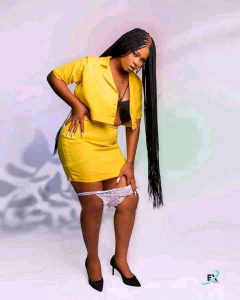 In what appears to be a rather bizarre way to take photos, the lady who donned a yellow top and skirt with a black bralette, posed with her panties slightly below her thighs.