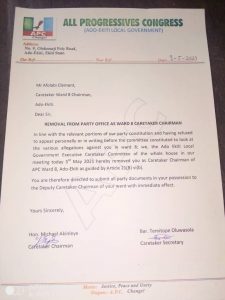 “In line with the relevant portions of our party constitution and having refused to appear personally or in writing before the committee constituted to look at the various allegations against you in ward 8, we the Ado-Ekiti local government Executive Caretaker committee of the whole house in our meeting today 3rd May 2021 hereby removed you as caretaker chairman of APC ward 8, Ado-Ekiti as guided by Article 21(B) vi(b)”