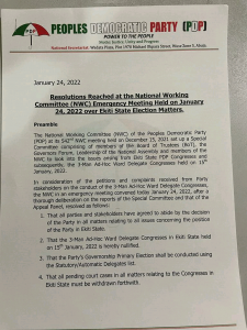 Heritagenewsng reports that the National leadership of the Peoples Democratic Party (PDP) has nullified the outcome of the party’s January 15, 2022 Ekiti state delegate congress.