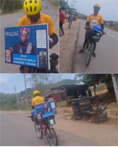 Speaking to this reporter in Aramoko at exactly 1.23pm on Saturday, Obobo said he set out in Plateau State 10 days ago with the aim of traveling to Lagos to present his bicycle to Asiwaju Tinubu.