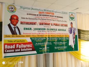 Professor Olumide of the Department of Civil Engineering at the Ekiti State University said this while delivering a public lecture Organized by the Nigerian Institution Of Civil Engineers(NICE) Ekiti State Chapter in honour of the Permanent Secretary Ministry of Physical Planning and Urban Development Engineer Johnson Oluwole Adeola on his Retirement and Birthday celebrations at the ministry of works Ado Ekiti on 8th December 2023 declared that Corruption, poor maintenance culture, Inadequate mix design amongst others are responsible for the continuous poor situations of roads in the country.