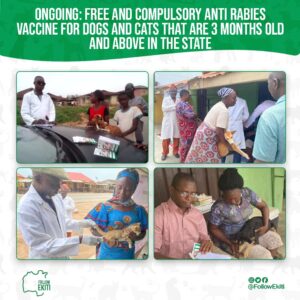 Therefore, Ekiti State Government has initiated a free and compulsory anti-rabies vaccination campaign for dogs and cats that are 3 months old and above.