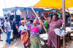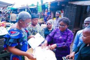 This necessitated the Special Adviser on Social Investment , Hon. Yemisi Ayokunle and her team ,and Director General, Office of Community Communications, Mrs Mary Oso- Omotosho and her team , hitting the markets in the company of Iyaloja of each market as well as the Program Officer from Abuja .