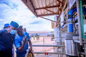 Governor Oyebanji expressed satisfaction at the healthy state of the farm. Specifically the Governor expressed satisfaction at the remarkable increase in the number of cows, the healthy state of the cows, increase in the quantity of milk production and employment opportunity at the diary farm.