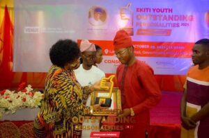 First lady of Ekiti State, Erelu Bisi Fayemi while presenting an award of excellence to a fresh graduate of FUOYE, Me. Esan.