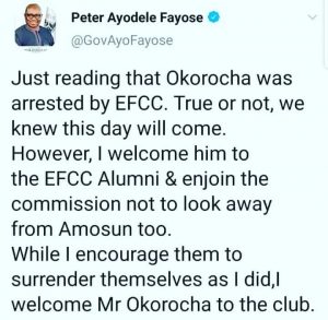 Fayose who described the arrest as expected welcomed the former governor to the club urged the EFCC to equally beam its search light on former governor of Ogun state, ibikunle Amosun.