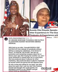 But Gbenga Adewusi, popularly known as Bayowa Films in his on response said, “With God on my side, I brought BUSOLA OKE ELEYELE UP from nobody to somebody without dating or seeing her nakedness. From Grass to Grace.