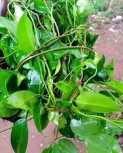 The name of the leaf in English is called African Parquetina, Yoruba name is Ewe Ogbo, Igbo name is Mgbidin Gbe / Udo Ohia, Hausa name is Kwankwanin, Botanical name is Parquetina nigrescens. it belongs to the family Periplocaceae.