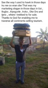 “Anytime I sensed low sales in Ilogbo, I would just trek to Aiyegunle (former Inu) then Iroko, Oke Oro ( Idaho) where I met the fine boy scout, Niyi Babade, the CNN journalist, whose father was the king and sometimes adventure to Ijero.