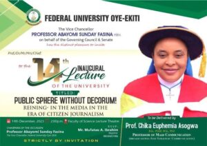 Prof. Asogwa who is also FUOYE’s Dean, faculty of Mass Communication and Media Studies, shall be addressing an important national issues on journalism on December 14, 2023 with her inaugural lecture entitled: “Public Sphere without Decorum! Reining-in the Media in the Era of Citizen Journalism”. She will be sharing her findings on an impactful research endeavours in this area and give recommendations for solving the problems associated with it.