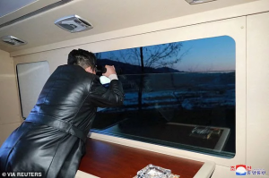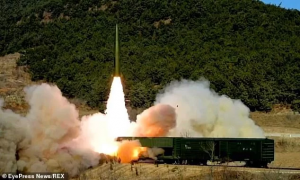 This picture released from North Korea’s official Korean Central News Agency last month shows a firing drill of railway-borne missile regiment is held in North Pyongan Province