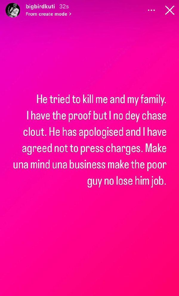 “He tried to kill me and my family. I have the proof but I no dey chase clout. He has apologised and I have agreed not to press charges. Make una mind una business. Make the poor guy no lose him job.” Seun posted on his Instagram story.
