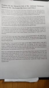 In the process of trying to explain to them and show them proofs I was mobbed and pushed around and when I stood firm that I will not handover my father’s property to them, the mother of Mrs. Titilayo Falade pointed at me and said to me verbatim “To ba so wipe o ni jawo Emi e ma Sonu si” that is I will lose my life if I don’t stay away from the land.