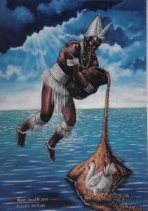 Obatala kneeled before Olodumare and said that he did not know the two (mystery) of creating land on Ikole Aye(Earth). Olodumare told Obatala that he would give him the ase(power) to make land on Ikole Aye(Earth).