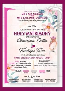 The wedding came up today Saturday, 24th, August 2024 when the Two, Oluwaseun & Temitope were joined and became ONE and should be addressed as Mr and Mrs Ogunleye henceforth.