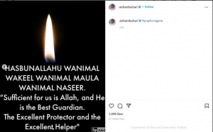 She shared an emotionless photo of herself alongside an image of candlelight on a dark background, which suggested mourning, with the hashtag “pray for Nigeria”.