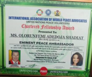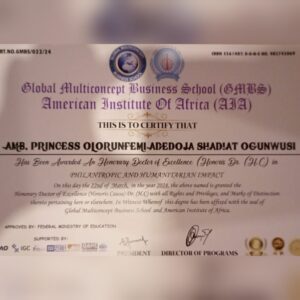 The Global Multiconcept Business School (GMBS) American Institute Of Africa (AIA) which honoured Princess Adedoja Ogunwusi with the Award noted her remarkable contributions to peace building and her tirelessly efforts towards the betterment of society through her non government organization.