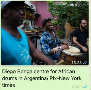 Apart from the Yoruba goddess , Yemonja center for worship and pilgrimage in the community of Chascomus, the only festival created and preserved by Afro-descendants to date in the country is San Baltasar, held in the province of Corrientes (almost 1,000 kilometers north of Buenos Aires) and in celebration of the king of Arabia who became famous in the western world for the history of the Kings Wizards. which seeks in Argentine popular music known as a factor of cohesion with the rest of the country’s cultures.Diego Bonga centre for African drums in Argentina/ Pix-New York times