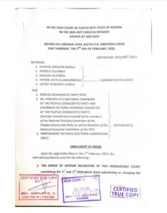 The motion read, “Upon the application filed on the 2nd February 2023, the claimants/applicants pray for the following: An order of interim injunction of this honourable court restraining the 1st and 2nd Defendants from substituting or changing the name of the claimants whose name have already been submitted to the 3″ Defendants as the is Defendants candidates for her National and State Assembly elections when the claimants have not withdrawn their candidature having regard to the provisions of Sections 3 of the Electoral Act 2022, as well as the provisions of the Constitution of the PDP as amended 2017 and its Guidelines pending the hearing and determination of the motion on notice for interlocutory injunction before the Honourable Court.”