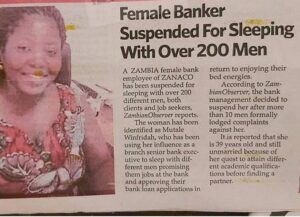 Zambian Watch newspaper reports that Ms. Mutale, a branch senior executive of ZANACO bank, was suspended by bank management for sleeping with over 200 different men who were both clients and job seekers.