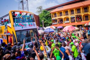 Their arrival in the specially-built open-top luxury bus further enlivened the area as Asiwaju and his entourage waved their brooms in acknowledgement of the cheers from the crowd.
