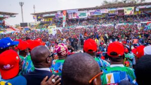 Addressing the cheering crowd, Asiwaju Tinubu urged Nigerians to be steadfast and not allow temporary hurdles placed before them by fifth columnists to prevent them from exercising their franchise and ensuring his victory and that of his party at the general elections.