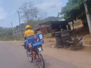 Clad in orange top and yellow crash helmet, Obobo’s appearance and the different inscriptions on his bicycle arouse curiosity as he rode through towns and villages in the state.