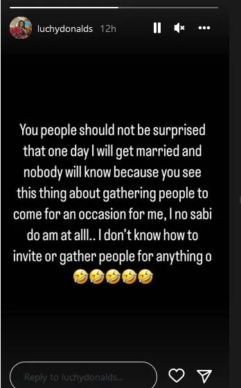 According to Luchy, “You people should not be surprised that one day I will get married and nobody will know because you see this thing about gathering people to come for an occasion for me, I no sabi do am at all. I don’t know how to invite or gather people for anything.”
