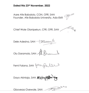 “Without being immodest, Ekiti State parades a good number of the leading lights and icons of the legal profession in Nigeria such as Aare Afe Babalola, OFR, CON, SAN, Founder & Chancellor of Afe Babalola University, Ado-Ekiti, ABUAD and former Pro-Chancellor and Chairman of Council of the University of Lagos; Chief Wole Olanipekun, CFR, OFR, SAN, former Attorney-General of the old Ondo State, past President of the Nigerian Bar Association (NBA), former Pro-Chancellor and Chairman of Council of the University of Ibadan; Dele Adesina, SAN, past General- Secretary of the NBA; Olu Daramola, SAN, Femi Falana, SAN, past President of the West African Bar Association (WABA); Dayo Akinlaja, SAN, past Attorney-General of Ekiti State and Gboyega Oyewole, SAN, past Attorney-General of Ekiti State, among several others, under whose auspices this statement is being issued.