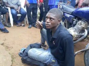 A 29-years-old boy whose name was given as Kenneth has been caught with two human heads inside a bag, the two human head is said to be that of his mother and father which he allegedly killed for money ritual purposes.