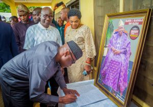 Ekiti Governor-Elect, Mr Biodun Abayomi Oyebanji signing the condolence register. With him is the Deputy Governor-elect, Chief(Mrs) Monisade Christianah Afuye and Prof. Olusola Eleka